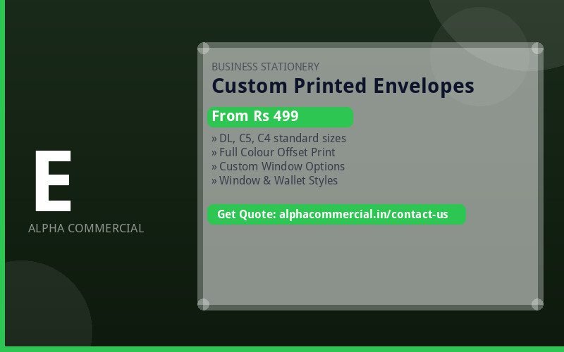 Branded printed envelopes for corporate correspondence. DL, C5 and C4 sizes with logo, address and brand colours. Starting ₹499 for 100.