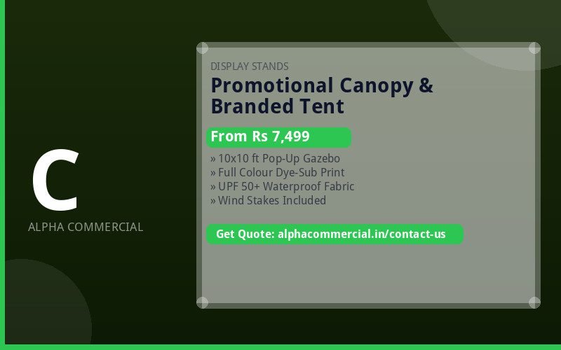 Make a statement at any outdoor event with a fully branded promotional canopy. Alpha Commercial supplies and prints custom pop-up tents and gazebos used by leading brands across Lucknow and UP for product promotions, trade shows, and outdoor retail activations.