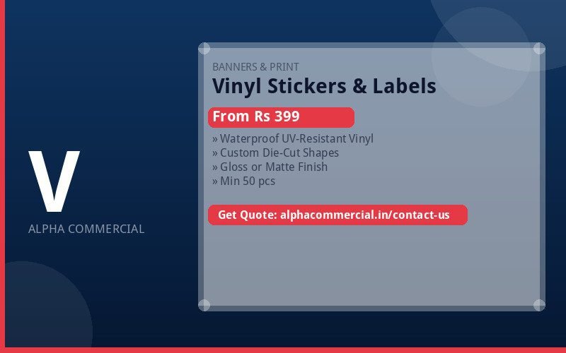 Make your brand stick. Alpha Commercial prints premium vinyl stickers with razor-sharp detail, vivid colours, and long-lasting durability — perfect for product labels, promotional stickers, laptop decals, and packaging seals.